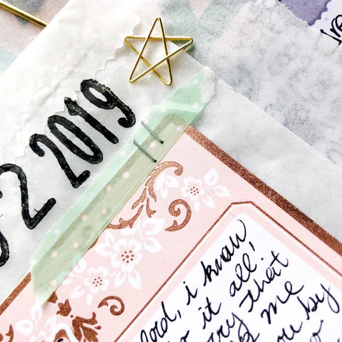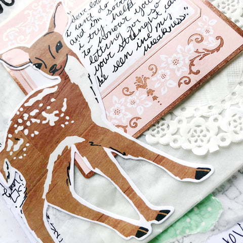 After grabbing some adorable die cuts from the flourish collection by Crate Paper, I added a mini doily, some tracing paper and a couple of touches of washi tape. I topped it off with a gold paper clip from Freckled Fawn, the stamped date, and some journaling.